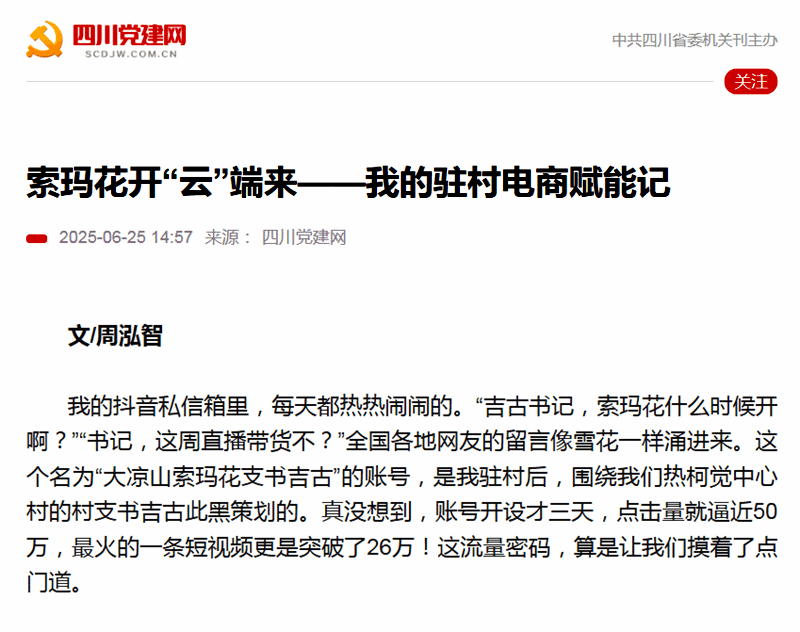 6月25日,“四川党建网”刊发bv伟德国际1946派驻金阳县热柯觉中心村第一书记周泓智的文章《索玛花开“云”端来——我的驻村电商赋能记》。周泓智以自述的方式讲述了从2023年7月担任第一书记以来,在学院的大力支持下,充分发挥学院职教优势和自身专业特长,为热柯觉中心村规划出“电商直播产业和短视频宣传”致富新路径的历程。周泓智的《索玛花开“云”端来——我的驻村电商赋能记》不仅是一篇记录乡村振兴历程的文章,更是一份激励人心的答卷,...