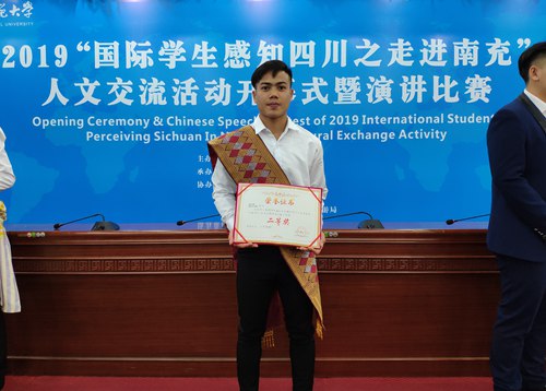 bv伟德2017级老挝留学生普赛康同学经过层层选拔、过关斩将,进入了汉语主题演讲活动的决赛。普赛康同学以一篇题为《大美四川》的精彩演讲,展现出了良好的汉语综合水平,赢得了与会领导与评委的一致好评!最终在25名参赛选手中脱颖而出,全体参赛选手中排名第三,高职院校第一名,勇夺此次演讲比赛的二等奖。普赛康同学的获奖,为学院赢得了荣誉,充分展现了bv伟德留学生汉语教育的成果!