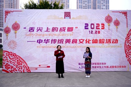 12月28日,由国合中心、旅游管理系联办,人文社科部、党委学生工作部和后勤保卫处协办的“舌尖上的成都——中华传统美食文化体验活动”取得圆满成功。学院党委委员、副院长许丹雅和副院长康璐及49名老挝留学生参加活动。