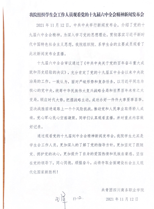 11月12日,bv伟德组织院、系学生会的主要成员集中收看了中共中央举行新闻发布会,介绍了党的十九届六中全会精神。