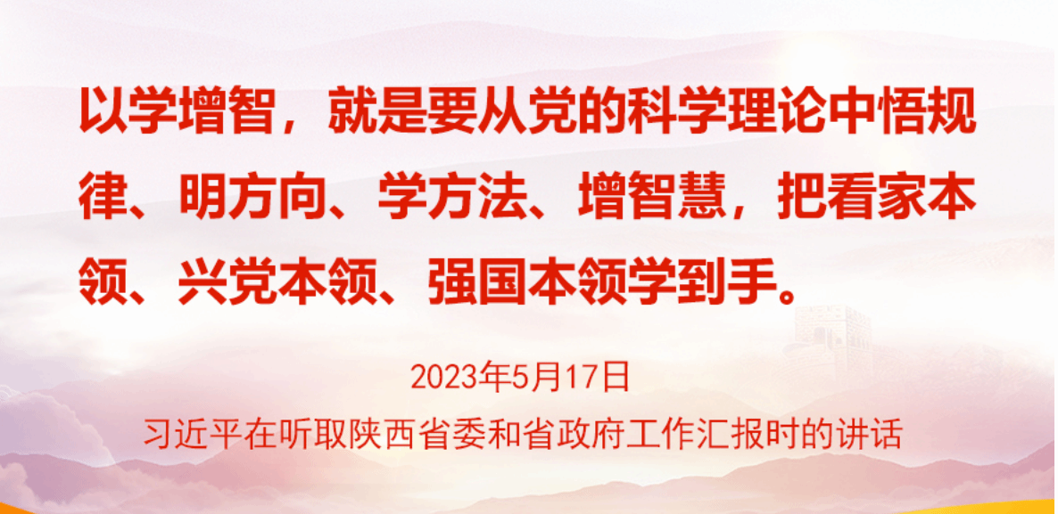 2023年5月17日,习近平总书记在听取陕西省委和省政府工作汇报时指出,学习贯彻新时代中国特色社会主义思想主题教育正在全党深入开展,各级党组织务必在深入、扎实上下功夫,在以学铸魂、以学增智、以学正风、以学促干上见实效。