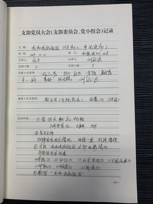 党支部组织全体党员收看了《国庆献礼》,学习了祖国七十年来取得的伟大成就的相关资料,通过视频和资料让全体同志对祖国七十年来发展历程有了一定了解。大家感悟到了我们的祖国已不再是那个贫穷羸弱的国家,经过这七十年的风风雨雨和艰苦卓绝的奋斗,终于迎来了伟大的复兴。最后,大家合唱《我和我的祖国》,通过这首当下最火的老歌,让我们再一次感受到“家是最小国,国是千万家;有了强的国,才有富的家”。