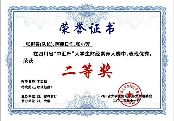 近日,由四川省教育厅主办、四川大学承办的2023年“中汇杯”四川省大学生财经素养大赛决赛落下帷幕,经过激烈的角逐,bv伟德李志勤、雷殷睿指导的学生团队获得省赛团体二等奖的好成绩。