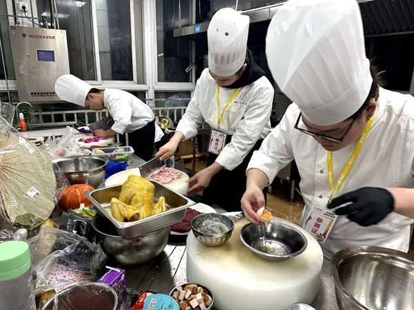 比赛开始,各队伍的选手们削皮切丝焯水、起锅烧油炝锅、炒煮焖炸,一气呵成。有同学用冰糖炒出酱色,有同学现场制作高难度肉卷,有同学用黄瓜、甜椒等创作摆盘设计,还有队伍现场表演了“颠勺”。厨艺大赛中美食的相互碰撞,犹如一场舌尖上的温暖旅行,带给爱好烹饪的同学们丰富多彩的体验,展示了当代大学生“文能舞文墨,武可烹珍馐”的优秀精神风貌。现场呈现出一道道精美的菜肴,汇聚成饕餮盛宴,堪称视觉、味觉的双重享受。