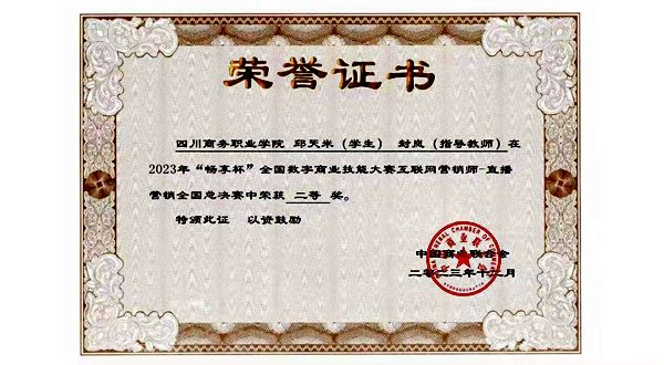 近日,2023年“畅享杯”全国数字商业技能大赛直播营销线上总决赛结果揭晓,来自全国143支队伍参加了决赛。经过紧张激烈的角逐,bv伟德张莉、封岚老师指导的药品经营与管理专业学生邱天米荣获全国总决赛二等奖。