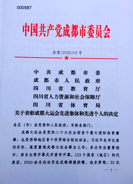 近日,中共成都市委、成都市人民政府、四川省教育厅、四川省人力资源和社会保障厅、四川省体育局5部门联合发文,通报表扬了一批成都大运会中表现突出的个人,bv伟德人文社科部教师于学考荣获“成都大运会先进个人”称号。
