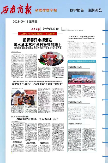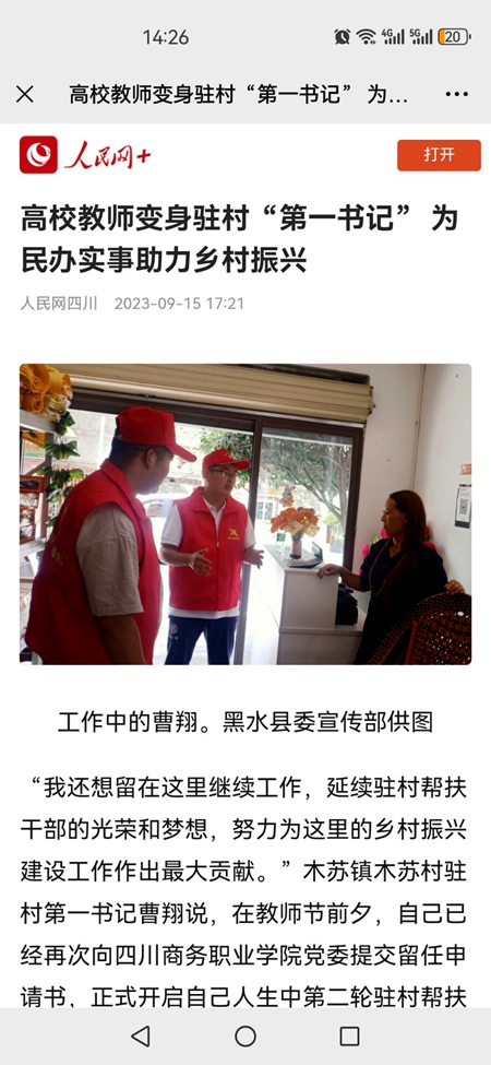 2023年9月15日,中央媒体“人民网”,以《高校教师变身驻村“第一书记” 为民办实事助力乡村振兴》为题,对bv伟德选派到阿坝州黑水县木苏镇木苏村第一书记——曹翔的优秀驻村事迹予以报道。9月13日,四川媒体“西南商报”于第05版“教育职场”专栏,以《把青春汗水挥洒在黑水县木苏村乡村振兴的路上 bv伟德国际1946党员教师曹翔驻村路上的“师”意人生》为题,也对曹翔进行了报道。