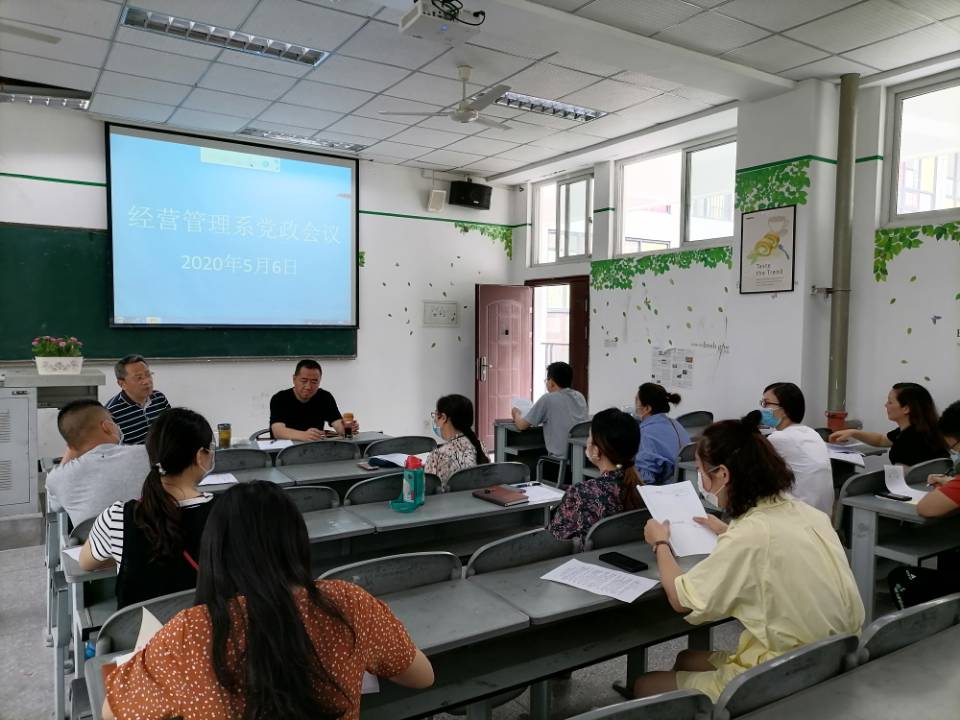 2020年5月6日上午10点,经营管理系全体党政人员、辅导员于第一教学楼202室召开全系党政工作会议。对本学期的重点工作进行了部署。会议由系主任梁栋主持。 会议认真贯彻落实《川商院[2020]17号-bv伟德国际1946关于印...
