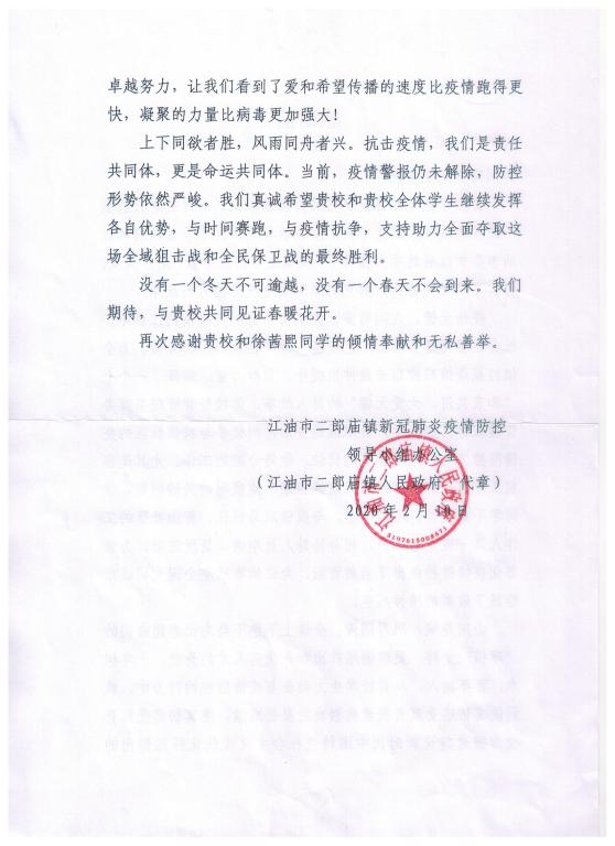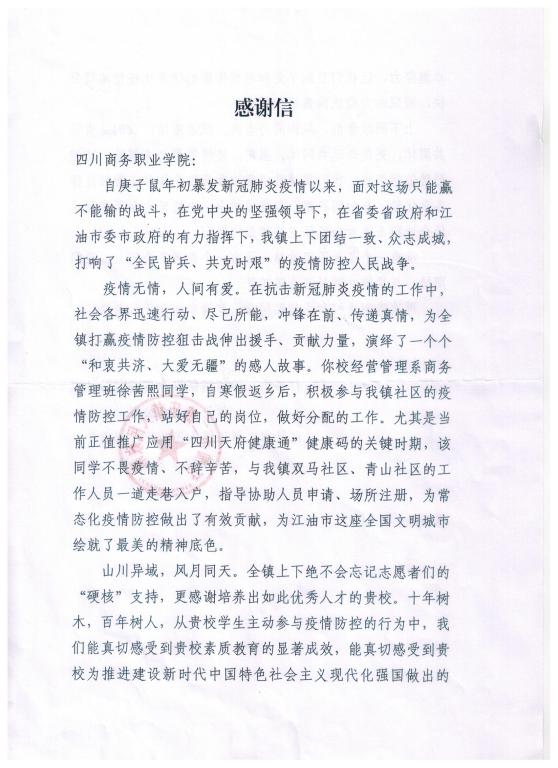 经营管理系20级商务管理班徐茜熙同学在去年新冠肺炎爆发期间,积极参加到江油市二郎庙镇社区的疫情防控工作中,不辞辛苦,为当地常态化疫情防疫工作作出了贡献。江油市二郎庙镇防疫办为表达感谢之情,特向bv伟德发来感谢信,充分肯定了徐茜熙同学的担当与奉献。
