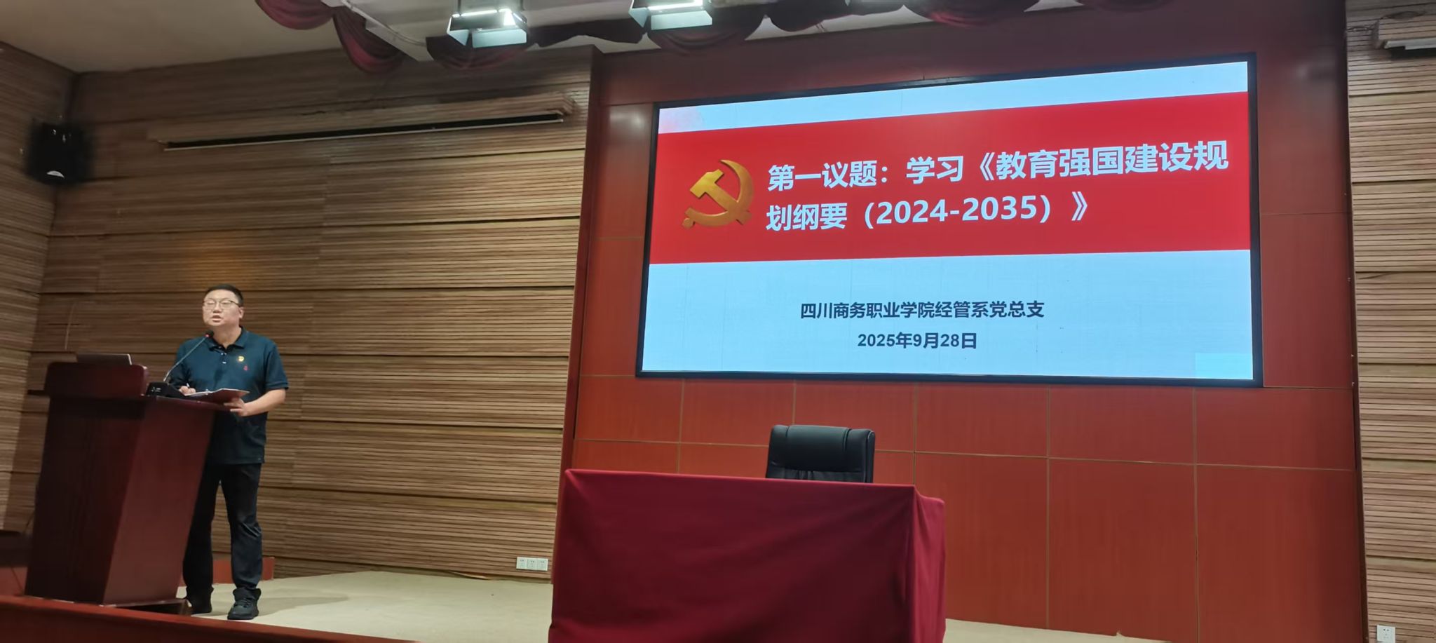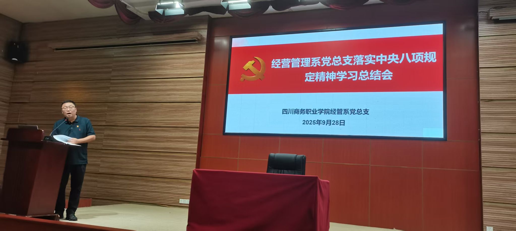 9 月 28 日,经营管理系党总支在商务信息交流中心召开全体党员大会,会议由系党总支书记杨洪主持,全体党员参加。