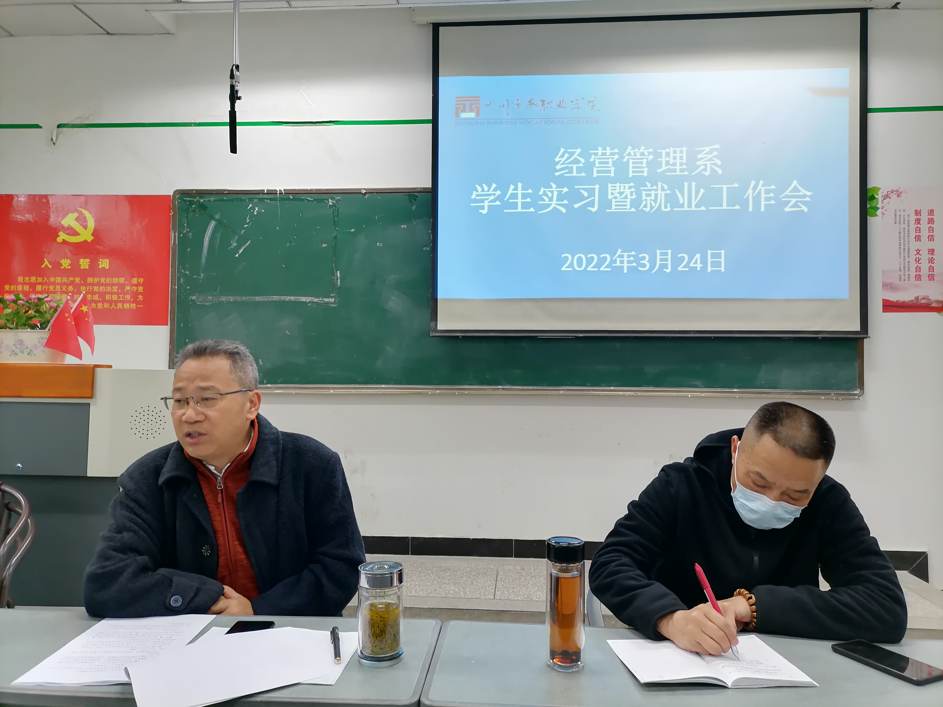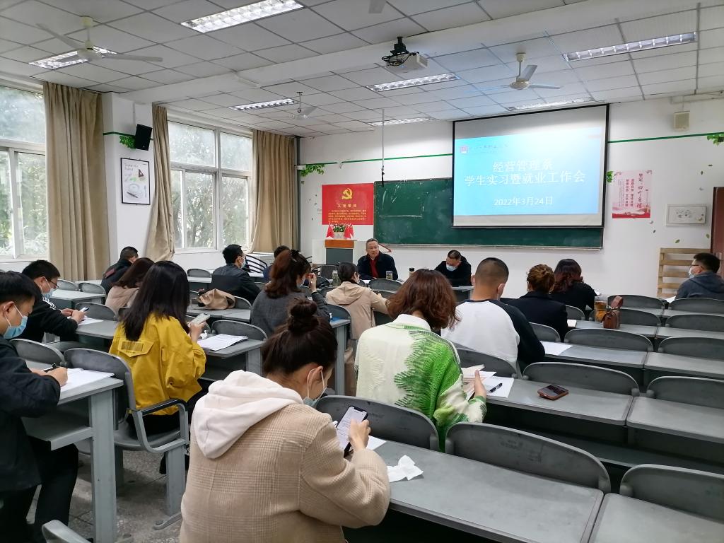 2022年3月24日上午9时,经营管理系于第一教学楼202室召开学生实习暨毕业生工作会会议。出席本次会议的有经管系主任梁栋、系党总支书记张一风、系副主任王琦、系党政办主任朱永泉、各专业负责人、全体辅导员、行政人员,会议由系主任梁栋主持。
