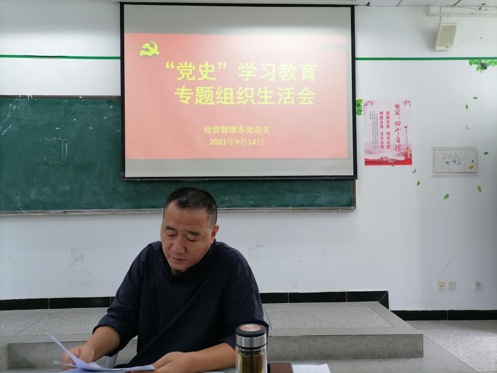 9月14日下午2:00,经营管理系党总支在1教202教室召开党史学习教育组织生活会,会议由总支书记郑海波主持。