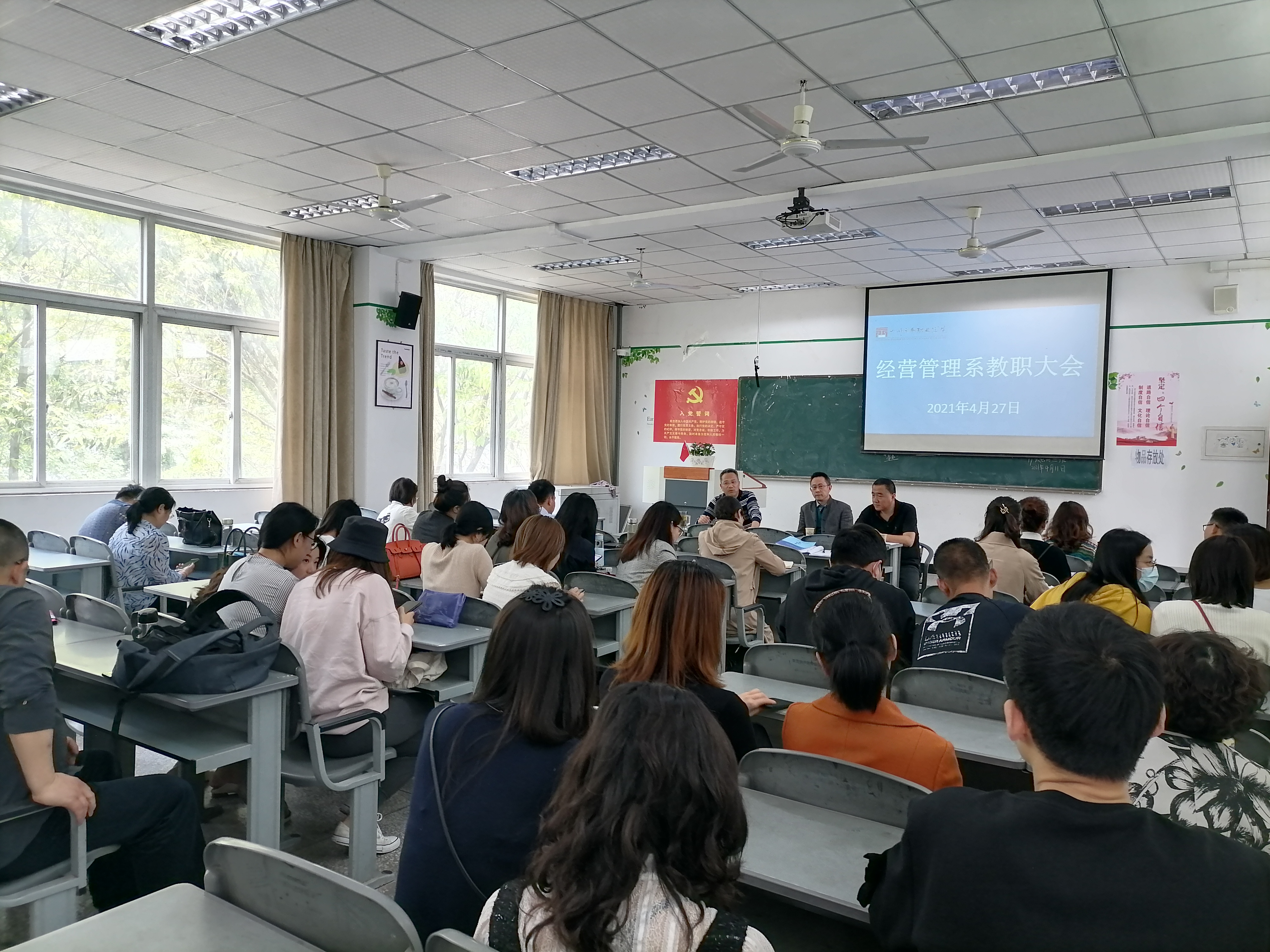 2021年4月27日下午2时,经营管理系于第一教学楼202室召开全系教职工会议。出席本次会议的有学院党委委员、纪委书记李文川,经管系主任梁栋,系党总支书记郑海波,系副主任王琦,全系教师,会议由系主任梁栋主持。