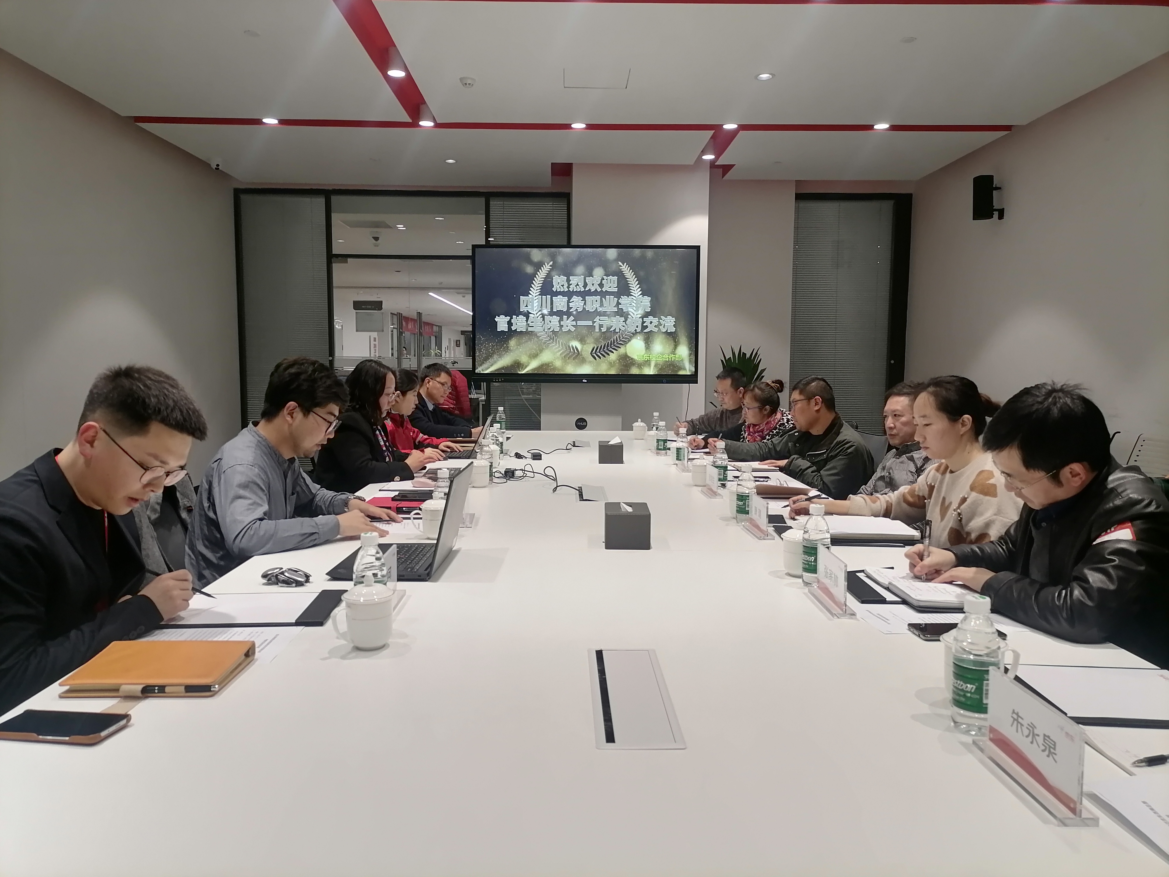 2023年3月2日学院副院长官培生、学院副院长康璐、经营管理系主任王琦、招生就业处处长张家林、经营管理系党总支书记杨洪、电子商务及物流专业教师一行到京东西南总部考察交流。