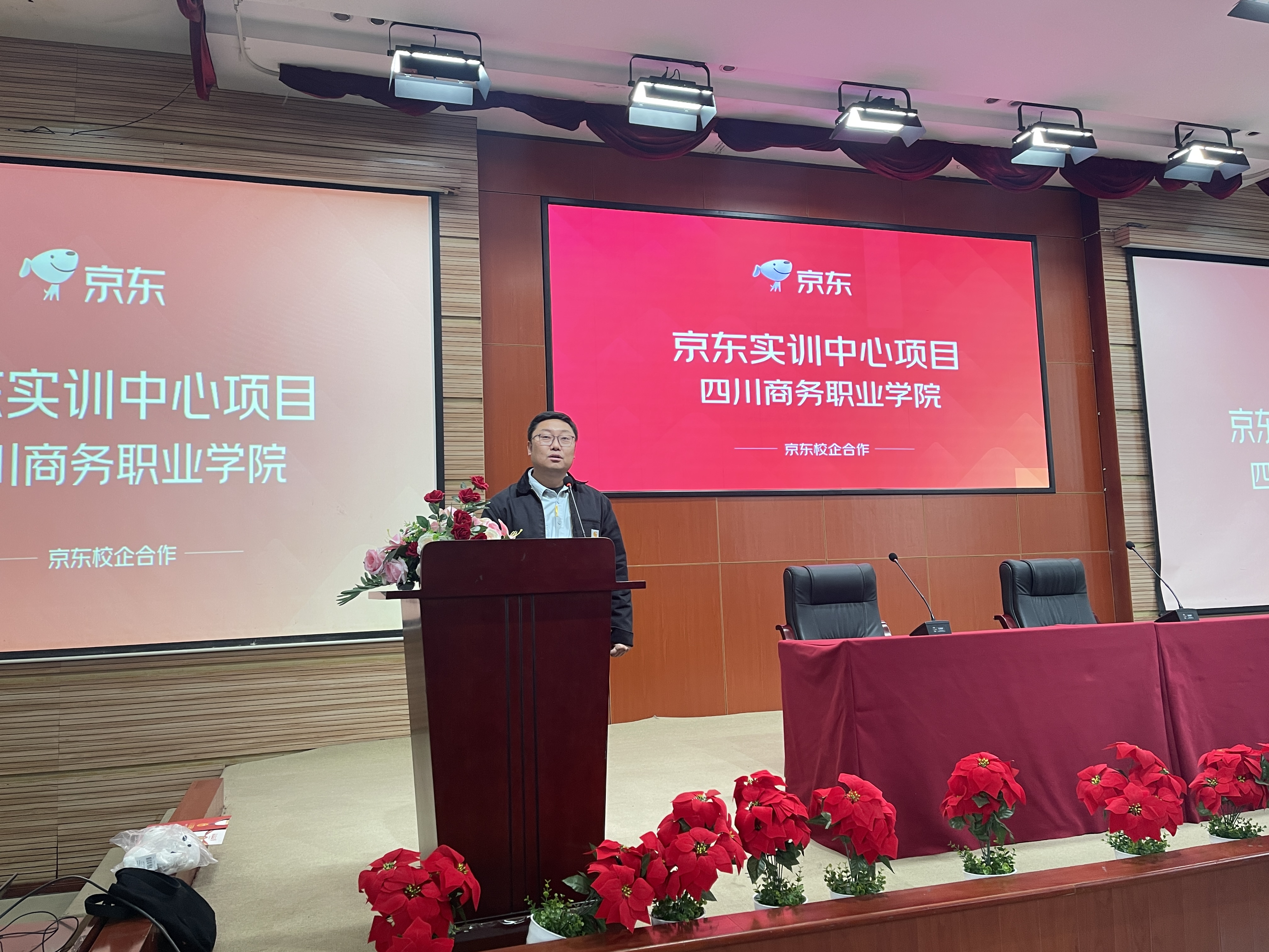 2023年3月17日中午,bv伟德经营管理系首门产教深度融合课程《京东客服能力实训》在学院商务信息交流中心隆重举行开班仪式,经营管理系主任王琦、系党总支书记杨洪、京东企业讲师陈一帆、团总支书记何俊烨、电商教研组所有专业教师、电商专业辅导员等参会。此次开班仪式由经营管理系电子商务专业负责人严珩老师主持。