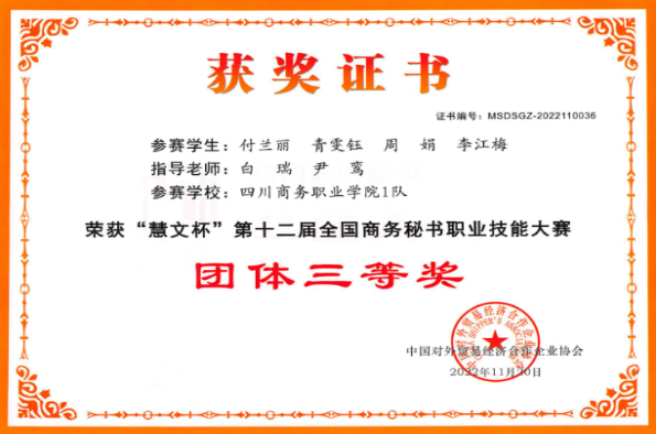 11月19日,“慧文杯”第十二届全国商务秘书职业技能大赛在南京举行。大赛由中国对外贸易经济合作企业协会主办,全国商务秘书与行政助理专家委员会和金陵科技学院承办。根据常态化疫情防控要求,本届大赛大胆创新竞赛形式,采用“线下+线上”相结合的形式进行,参赛规模再创新高。来自全国23个省、市、自治区83所本专科院校的155支参赛队,近千名师生相聚“线上”,同台竞技。经过激烈角逐,bv伟德国际1946二队获团体二等奖,一队获团体三等奖。