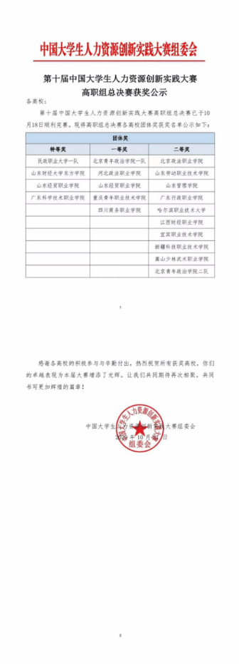 近日,第十届中国大学生人力资源创新实践(HRU)大赛高职组总决赛圆满结束,经营管理系人力资源管理专业学子荣获团体一等奖,1名学生获得分赛道特等奖,1名学生获得分赛道特等奖,3名学生获得分赛道一等奖,2名学生获得分赛道二等奖,为学校赢得荣誉。