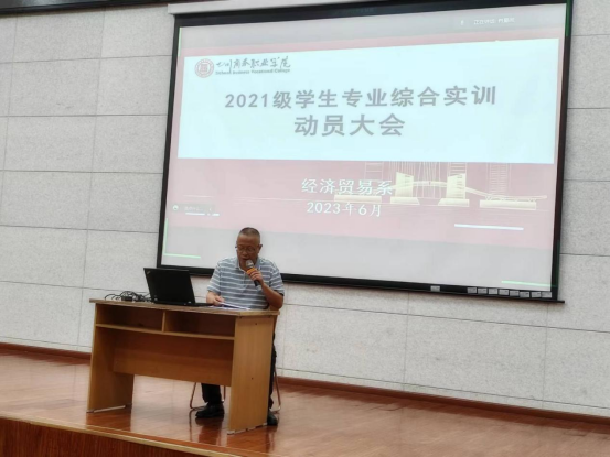 为贯彻落实教育部关于职业教育实践课程的相关要求,扎实开展好我系2021级学生专业综合实训教学工作,6月8日中午,经济贸易系在第一、第二学术报告厅线上线下同步开展学生专业综合实训动员暨安全教育大会。系主任朱贵水、党总支书记肖勇、行政人员、辅导员和2021级全体学生等参加了动员大会。大会由副主任李静主持。