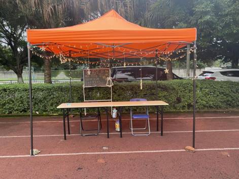 2021年10月7日下午,经贸系商英学生会全体成员在文家校区西区设立军训志愿服务点位。本次摆点位的目的在于为10月8日到来的大一军训提供行李存放以及能量补给的作用。10月7日下午五点学生会成员在西区主席台旁设立一棚两桌作为十四天服务点位。