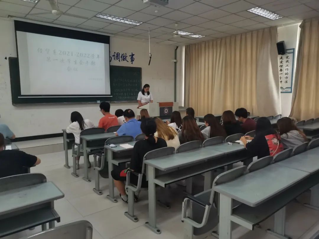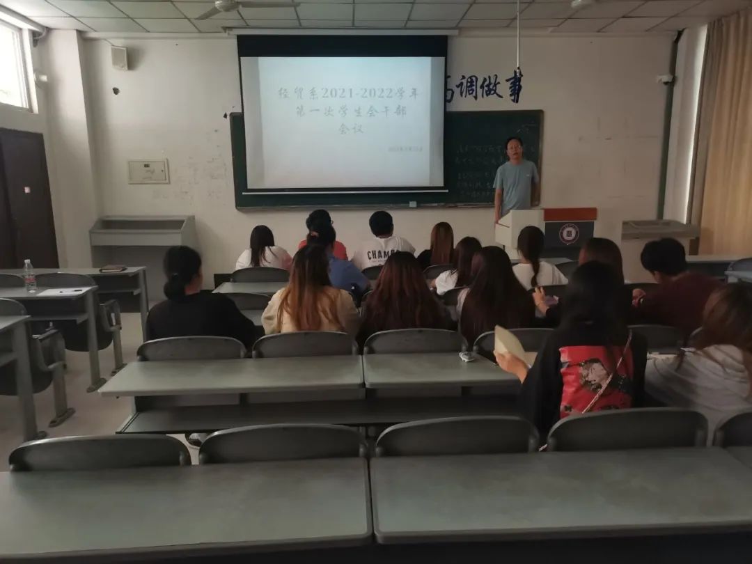 经济贸易系于2021年9月23日中午13:30在4教4106教室举行经贸系第11届学生会第一次学生会干部会议。系党总支书记管齐峰、辅导员庞莹莹老师出席会议,全体学生会干部参加会议。