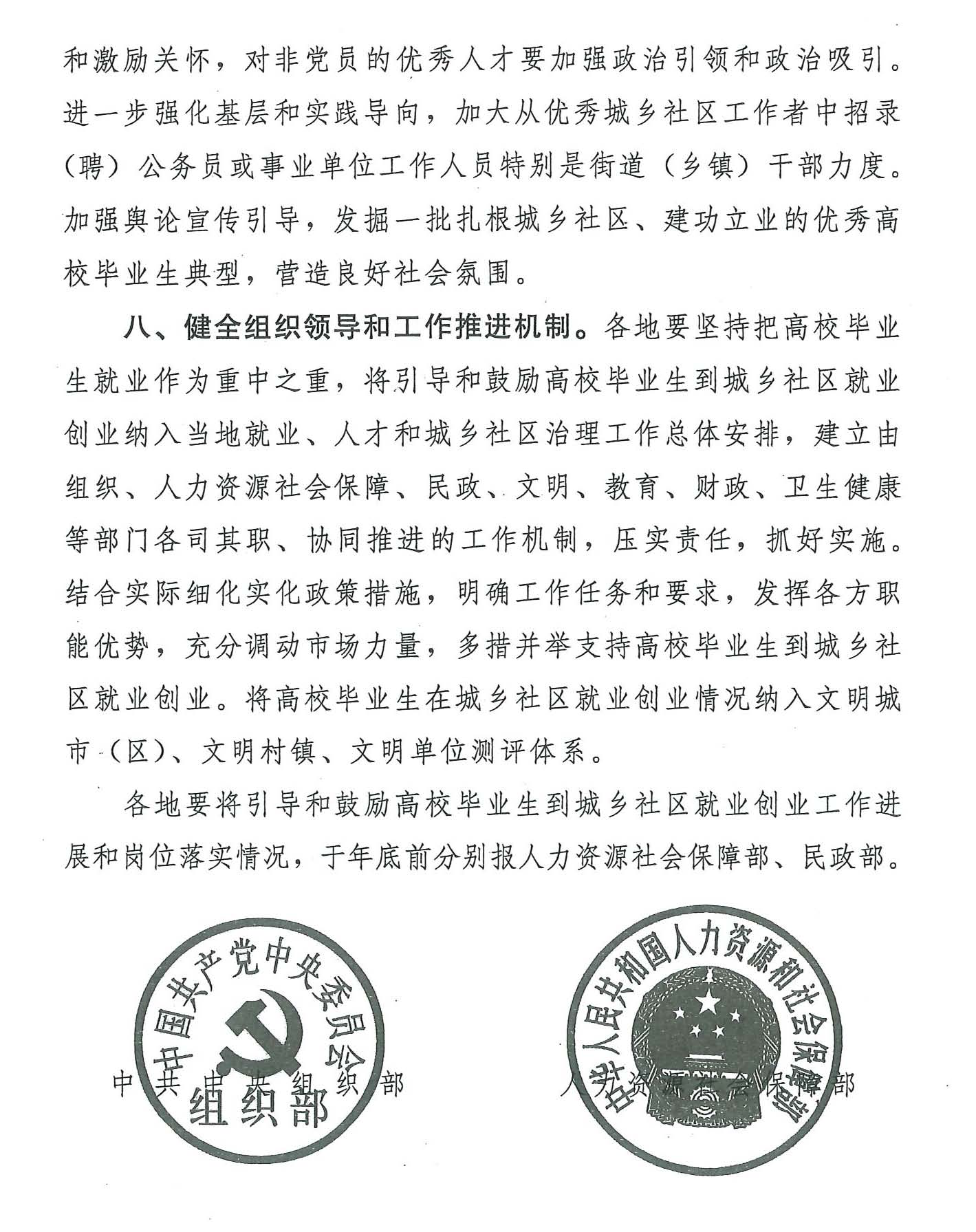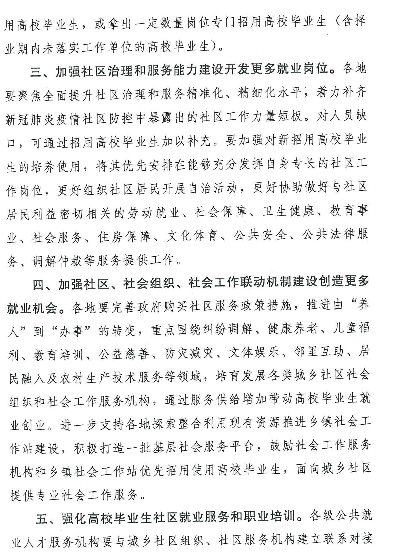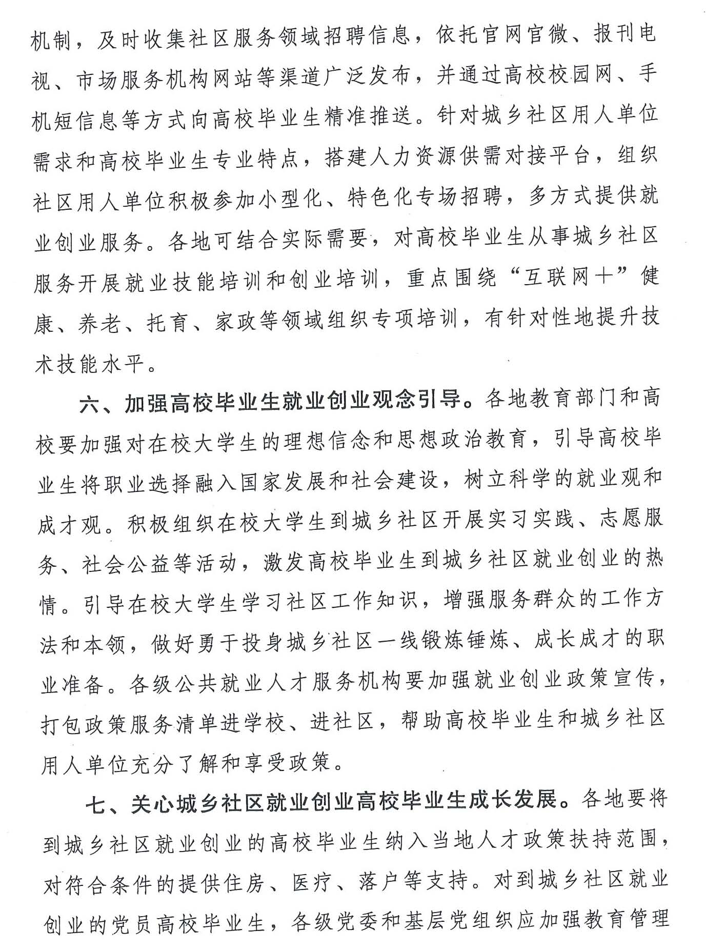 一、各地要加快社区专职工作者职业体系建设,完善社区专职工作者“选育用管”制度,加大从高校毕业生中招用社区专职工作者力度。积极引导符合条件的高校毕业生进入社区“两委”班子,社区“两委”集中换届时,班子成员中原则上要有1名35岁以下的高校毕业生。加大从符合条件的社区专职工作者中招录(聘)公务员或事业单位工作人员特别是街道(乡镇)干部力度,不断拓宽到社区就业高校毕业生成长空间。