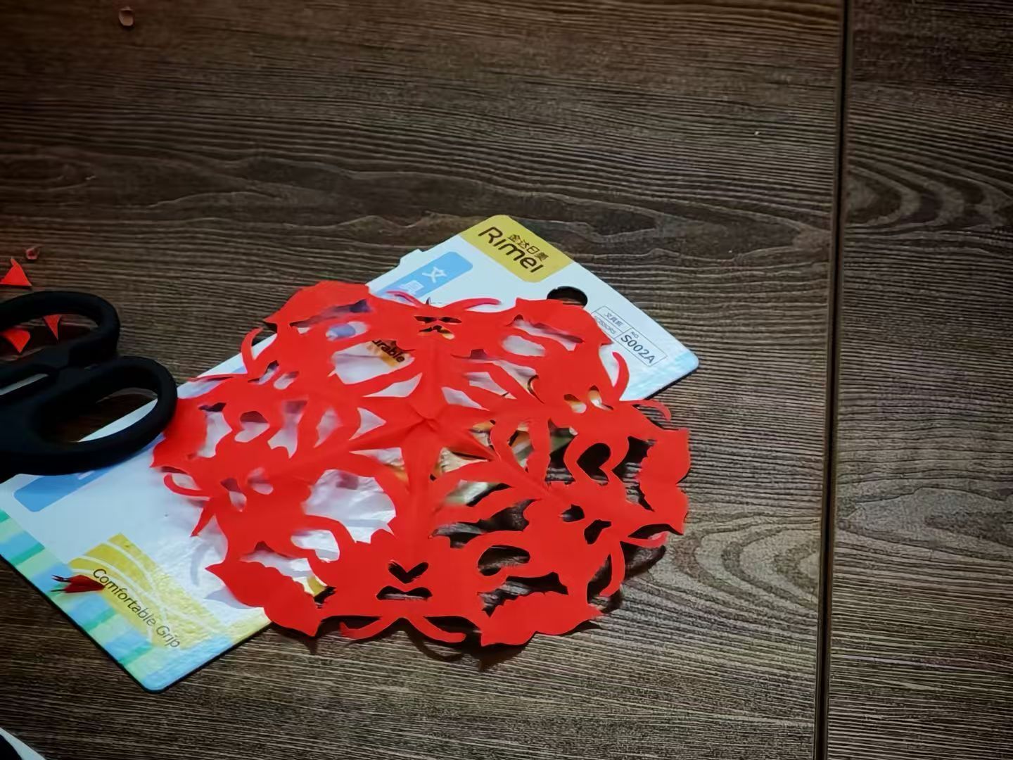 有的同学专注于繁复的对称窗花,有的则大胆尝试立体的造型。当平面的红纸在指尖站立起来,那份惊喜与成就感,也清晰地写在了每个人的笑脸上。