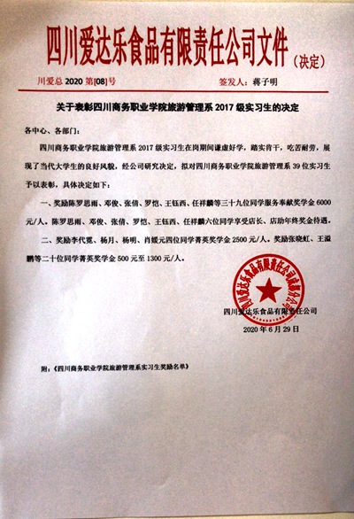 6月29日10:00,在学院商务信息交流中心主会场及2个网络分会场,bv伟德国际1946与四川爱达乐食品有限公司隆重举行了2020年实习生表彰大会。