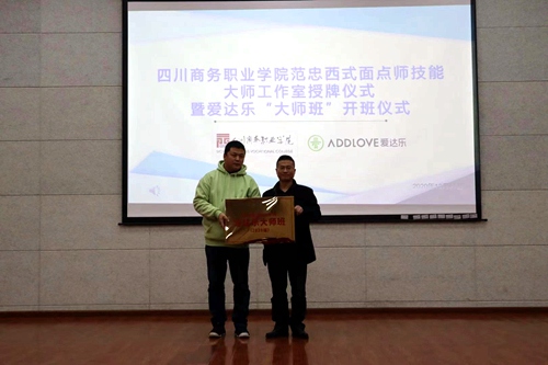 副院长向宏志将学院的“范忠西式面点师技能大师工作室”铜牌授予范忠大师,范忠大师也将“范忠西式面点师技能大师班”铜牌授予旅游管理系。“大师班”代表肖小龙同学会上发言,立志 “把握爱达乐平台,追随范忠大师,刻苦学习,技能成长,献身于烘焙事业”。
