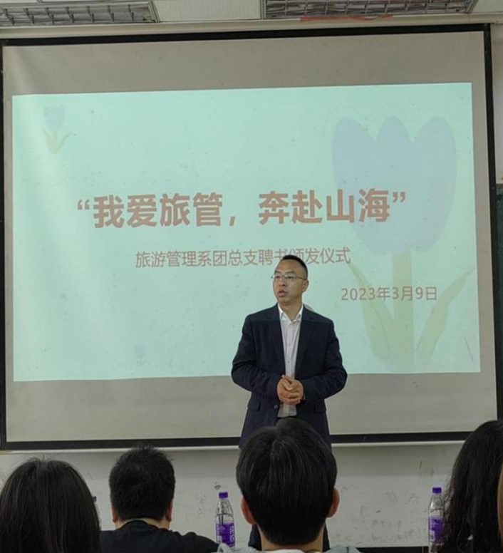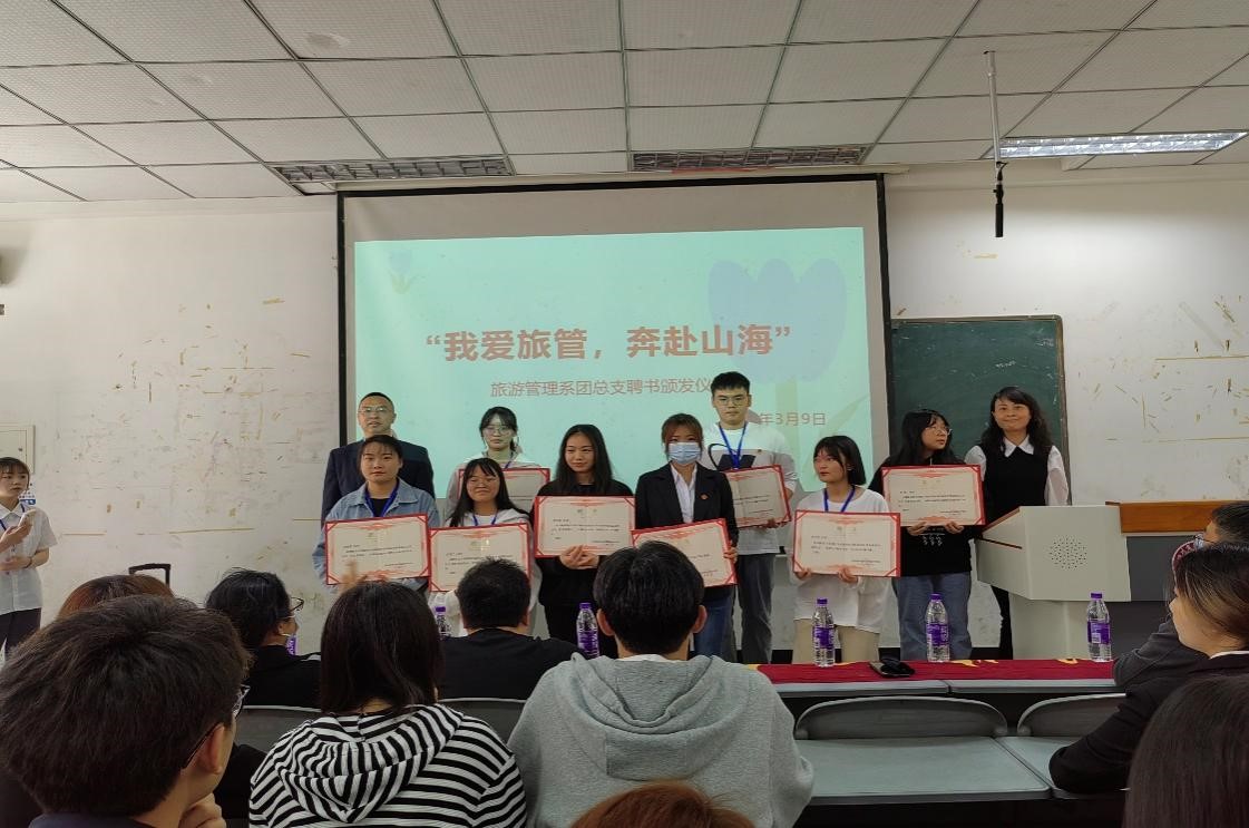 为进一步加强我系学生干部的队伍建设,充分发挥学生干部的先锋模范作用,3月9日中午12时40分,旅游管理系团总支在教学楼5204举行了主题为“我爱旅管,奔赴山海”聘书颁发仪式。
