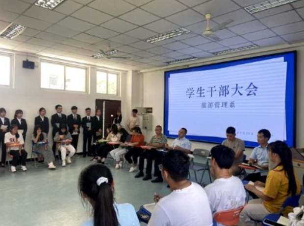 9月28日,旅游管理系举行新学期学生干部会议。会议由团学指导老师郝灿主持,系党总支书记陈根元、副书记肖勇、全体专兼职辅导员、系学生会及各班团支部主要干部参加。