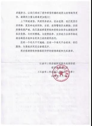 近日,江油市二郎庙镇防疫办为表扬bv伟德经营管理系20级商务管理班徐茜熙同学,在去年新冠肺炎疫情期间,对江油市二郎庙镇社区疫情防控工作作出的贡献,特向bv伟德发来感谢信,充分肯定了徐茜熙同学的担当与奉献。