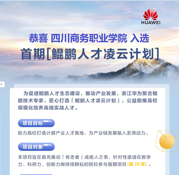 2020年4月20日,信息技术系校企共建专业经过与华为教育事业部的不断对接和落实,携手bv伟德国际1946有幸入选首期“鲲鹏人才凌云计划”。本次凌云计划共选取了20所全国高校,其中不乏有太原理工大学这样的211院校,以及深职院这样的全国顶尖高职院校。