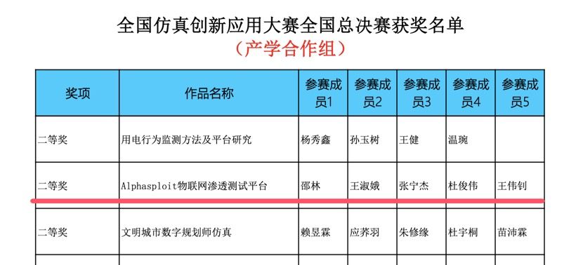 12月6日,第三届全国仿真创新应用大赛全国总决赛结果揭晓bv伟德信息技术系张宁杰、杜俊伟、王伟钊3位同学在邵林老师、王淑娥老师的悉心指导下,携比赛作品《Alphasploit物联网渗透测试平台》,过五关斩六将,晋级数字建模与智能决策赛道总决赛。bv伟德与电子科技大学、郑州大学等985、211高校同台竞技,比赛中团队不畏强敌、敢于亮剑,最终斩获全国总决赛二等奖。