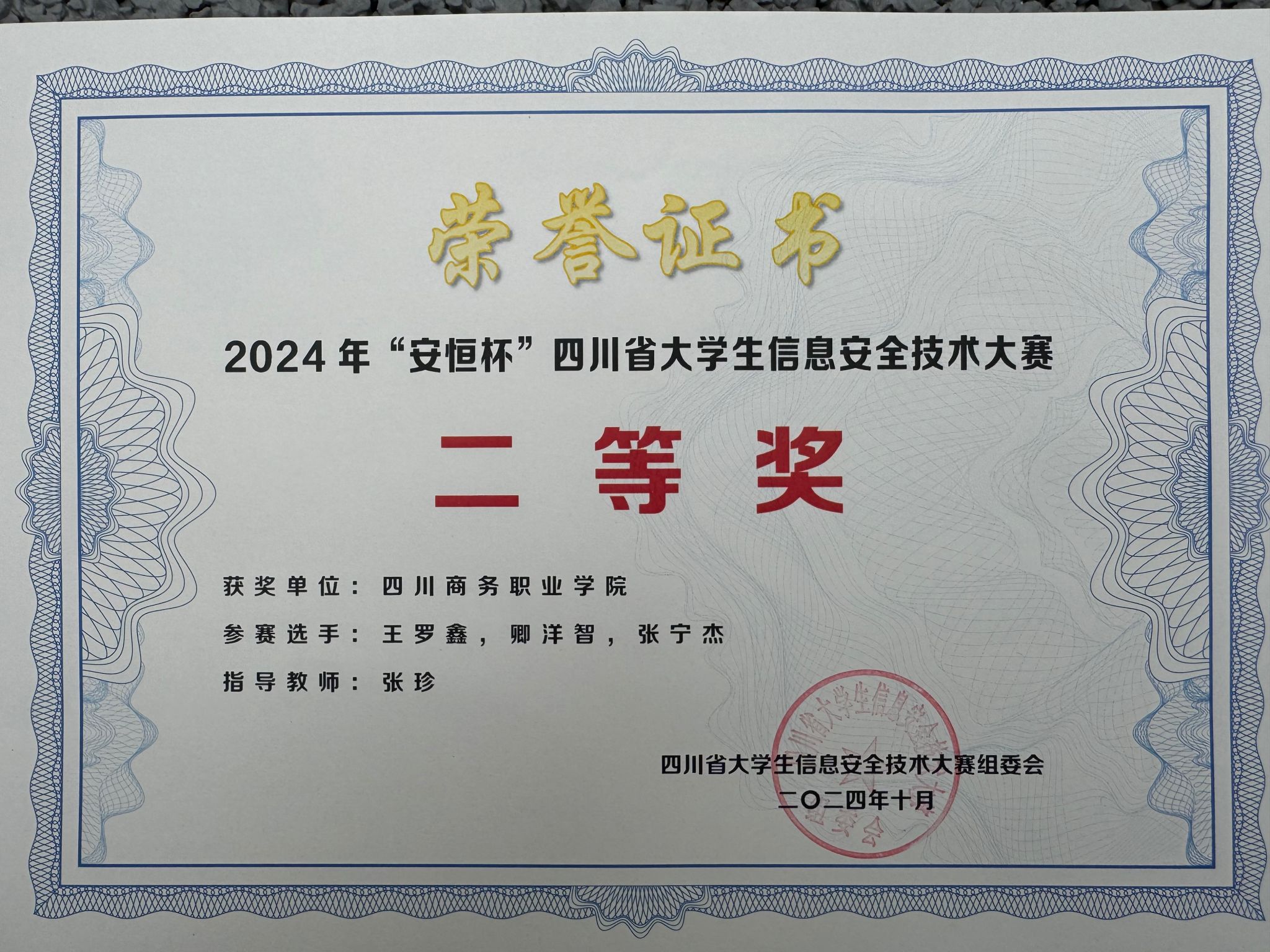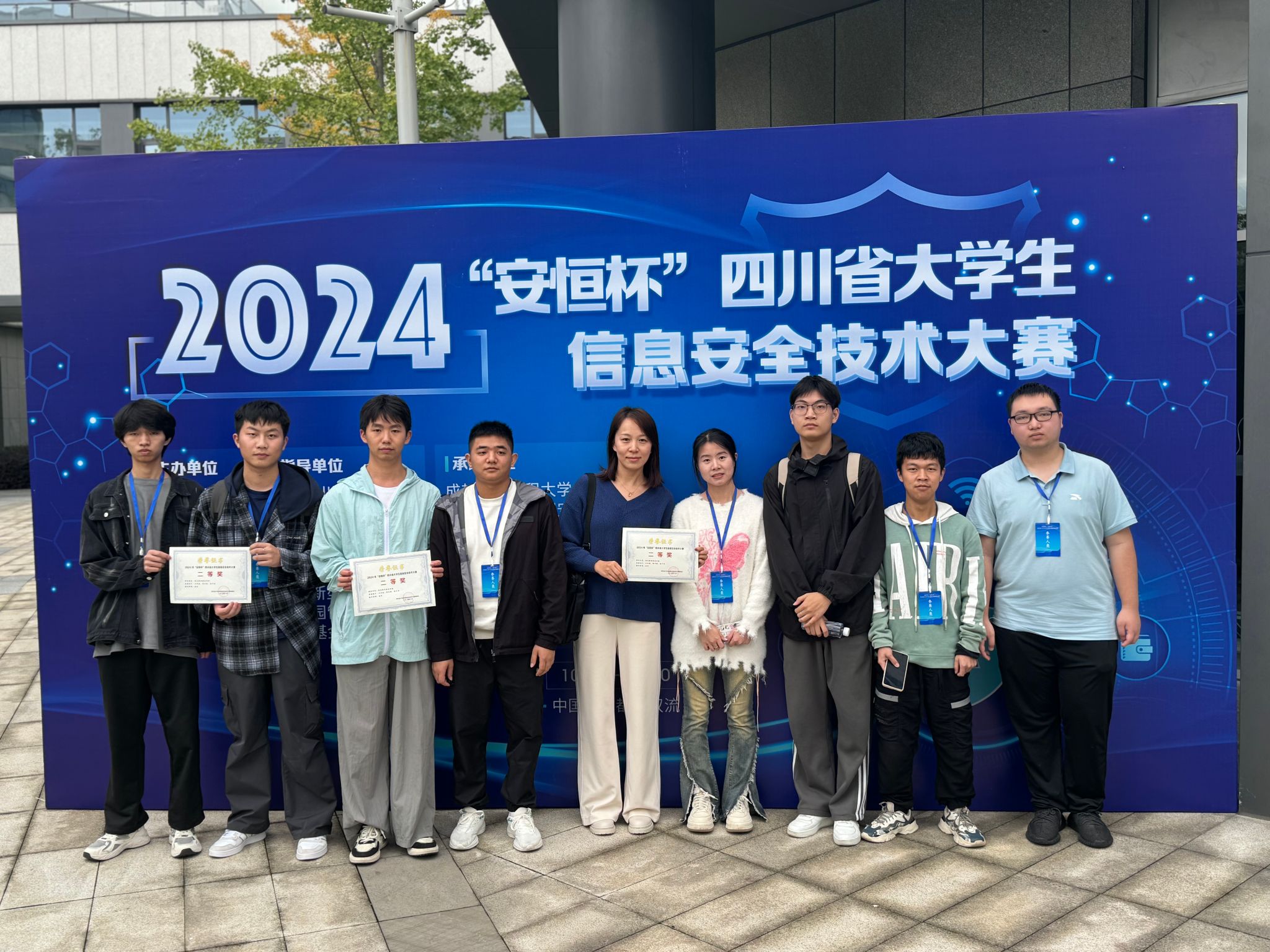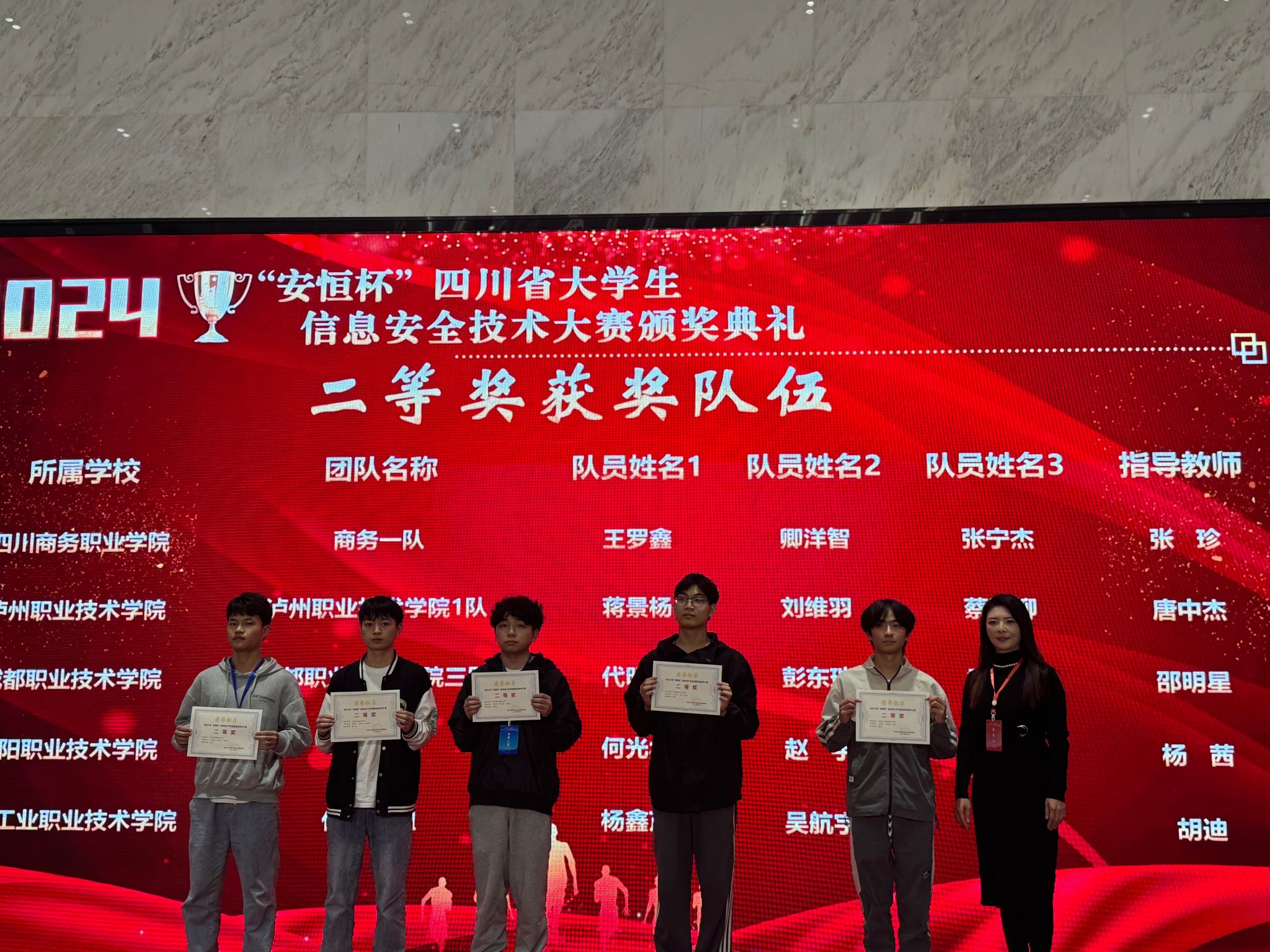 2024年10月,由四川省教育厅主办,中共四川省委网信办和四川省公安厅协办的2024年“安恒杯”四川省大学生信息安全技术大赛在成都信息工程大学双流新型产业学院举行,bv伟德信息技术系组织了3支队伍9名学生参赛,最终由张珍老师指导的商务一队斩获二等奖。