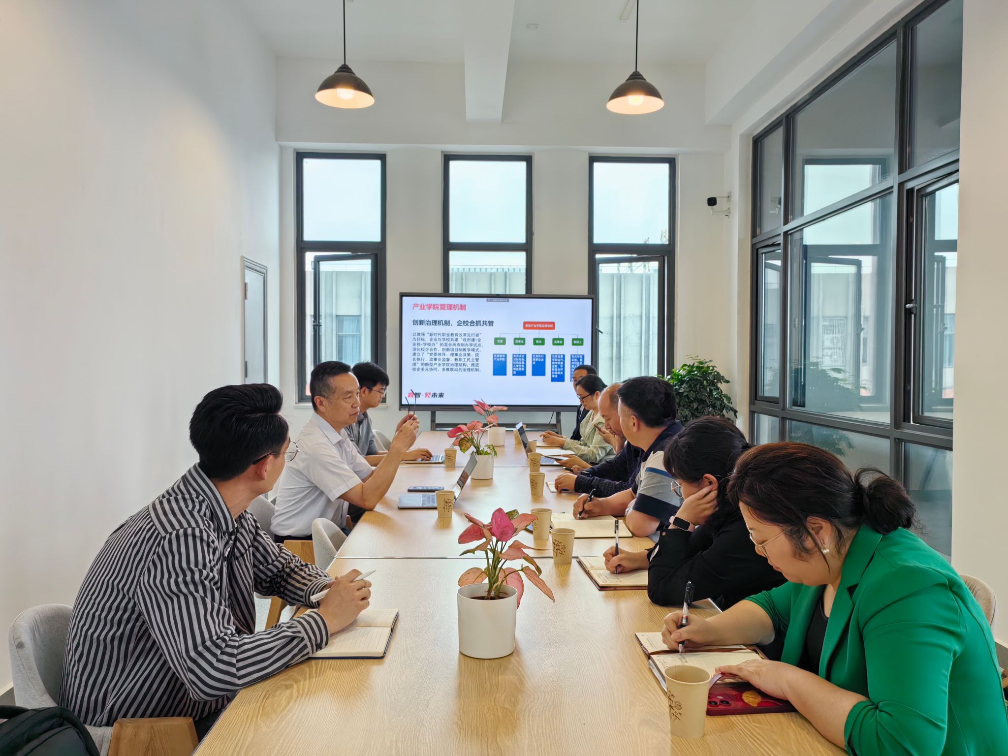 双方参观了新华三芯云产业学院的教学课堂和项目工作室后,进行了深入的座谈交流。李亚平院长详细介绍了新华三芯云产业学院的基本情况,包括管理机制、专业设置、人才培养方案、项目化课程体系和一体化实训基地建设等,重点介绍了以学生为中心的教学活动的组织形式。双方还就订单培养、课程设置、校企师资队伍建设和管理、招生就业、赛事项目孵化等方面进行了交流探讨。