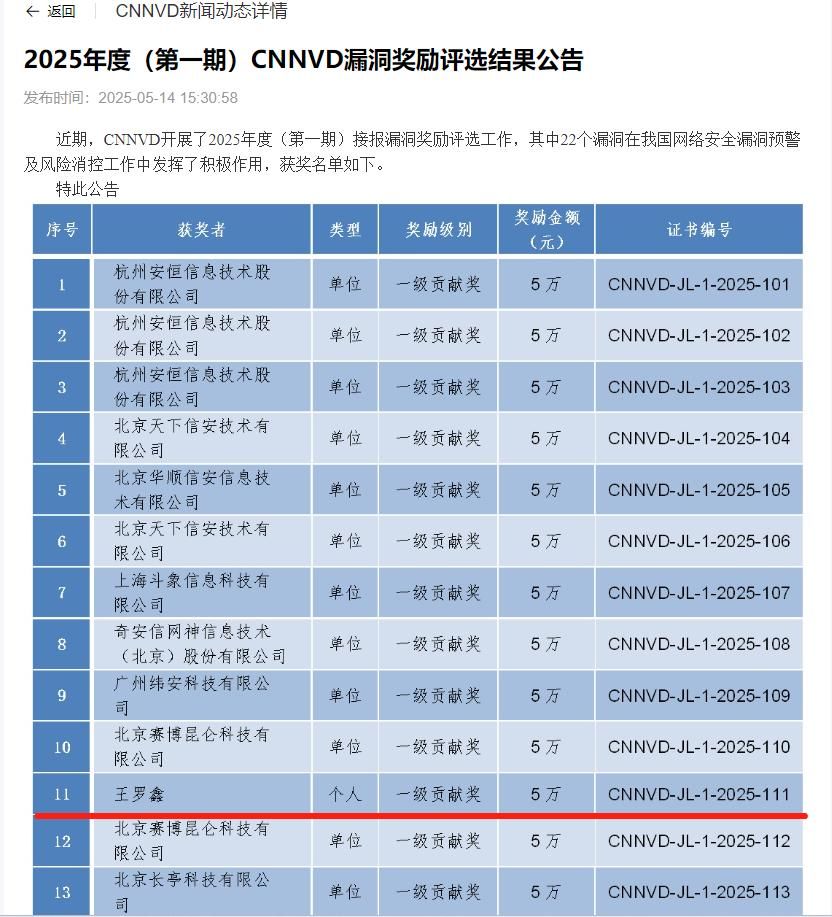 2024年度国家信息安全漏洞库(CNNVD)工作总结暨优秀支撑单位表彰大会在北京召开。bv伟德信息技术系22级信息安全技术应用1班王罗鑫凭借出色的漏洞发现、深度分析及高效通报能力,从众多顶尖安全企业参与者中脱颖而出,成为唯一一个以个人名义荣获“2025年第一期漏洞奖励”一级贡献奖,并获奖金5万元,展现了bv伟德学子领先的技术实力也为我国网络安全漏洞预警及风险消控工作发挥了积极作用